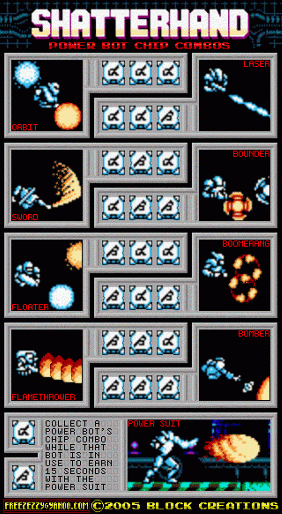 Quando voce faz uma combinaçao diferente no jogo shatterhand pode adquirir uma armadura ou robos chamados de 'Satellite Bot Abilities' que te ajudam,cada um deles tem uma arma diferente,no solbrain voce ganhar armas muito potentes que vao te ajudar a derrota os chefes das fases.