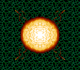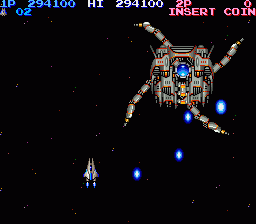 um dos chefes mais difíceis do jogo na versão do arcade. Embora seja inteiramente imóvel, ele tem uma forma de defesa que seja quase impossível de evitar. Os três núcleos na parte superior da tela encontram-se protegidos por três camadas de escudos. Estes escudos são facilmente removidos, e podem até mesmo ser destruído antes do ataque chefe.Isso ocorre quando os núcleos começam a enviar orbs azuis. Essas esferas salta ao redor do chefe, em uma trajetória muita rápida.A sala fica cheia de olhos azuis e você dever esquiva-se todos tornando quase impossível. Há duas estratégias que são conhecidos para derrotar esse chefe. O primeiro método é muito seguro, mas incrivelmente lento e chato. É possível esperar todo este chefe para fora e sobreviver todo o calvário se você estacionar o sua nave no canto inferior direito da tela (mostrado à direita) antes de qualquer orbs são disparados. Você literalmente tem que ficar lá por alguns minutos e esperar que os núcleos se abrirem e fechar ate destruir o chefe esta estratégia permitirá que você sobreviver ate o final do combate contra o chefe.